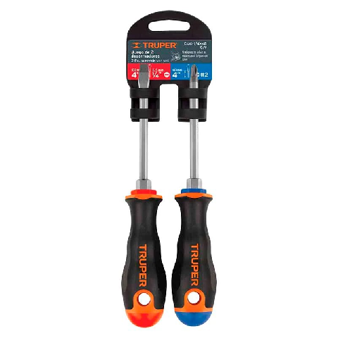 - Contenido: El juego contiene un desarmador de punta plana de 1/4″ x 4″ y un desarmador de punta de cruz PH2 de 1/4″ x 4″, según la ficha técnica oficial de Truper.