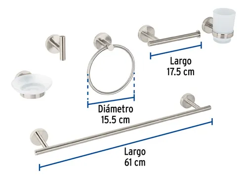 1 Jabonera con plato, 1 Porta vaso Cepillero, 1 Portarollo, 1 Toallero de barra de 62 cm, 1 gancho, 1 Toallero de argolla |